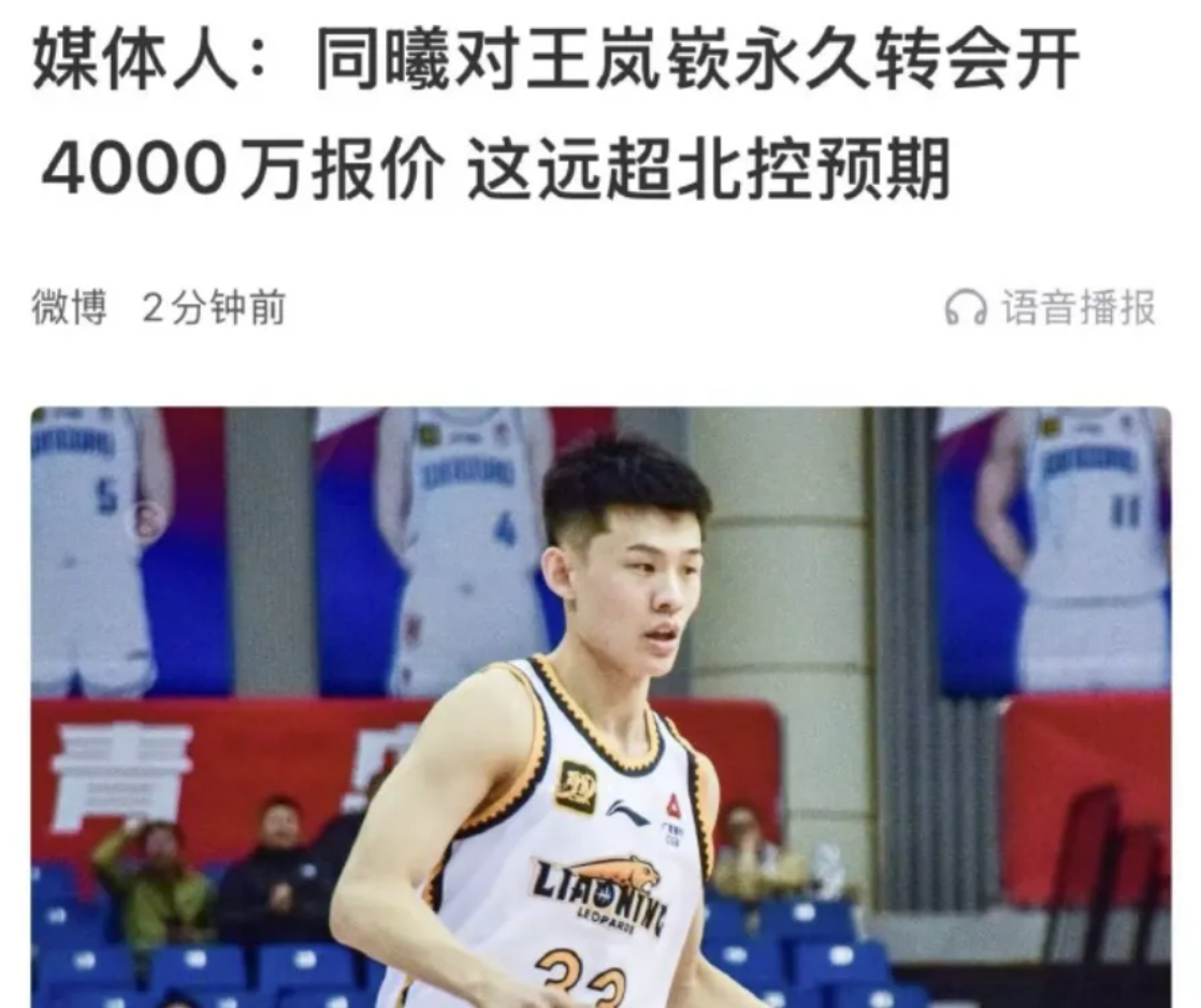 据媒体人报道,同曦男篮开出了4000万元的转会费报价,大大超出了北控男篮的心理预期。北控男篮觉得一个王岚嵚不值得4000万元这么贵,他们不想当冤大头,于是没有达成交易。